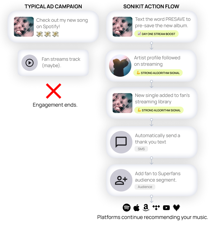 Streaming platforms naturally recommend music to fans when they show strong engagement signals. Following an artist or adding an album to their library tells platforms that this fan is highly interested. If you can turn a single action into a follow and a save while building your audience, that's way more than a click on a Spotify ad. Once an ad campaign stops, engagment ends. Action Flows run automatically as fans interact.