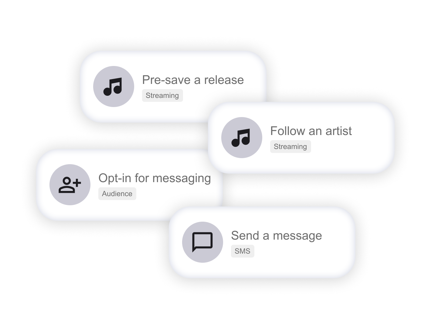 Action Flows work across SMS, email, Instagram, Spotify, and all other streaming platforms. Fans can start anywhere and your system connects everything behind the scenes. Build custom combinations that fit your style and audience to reach the best balance and conversions.
